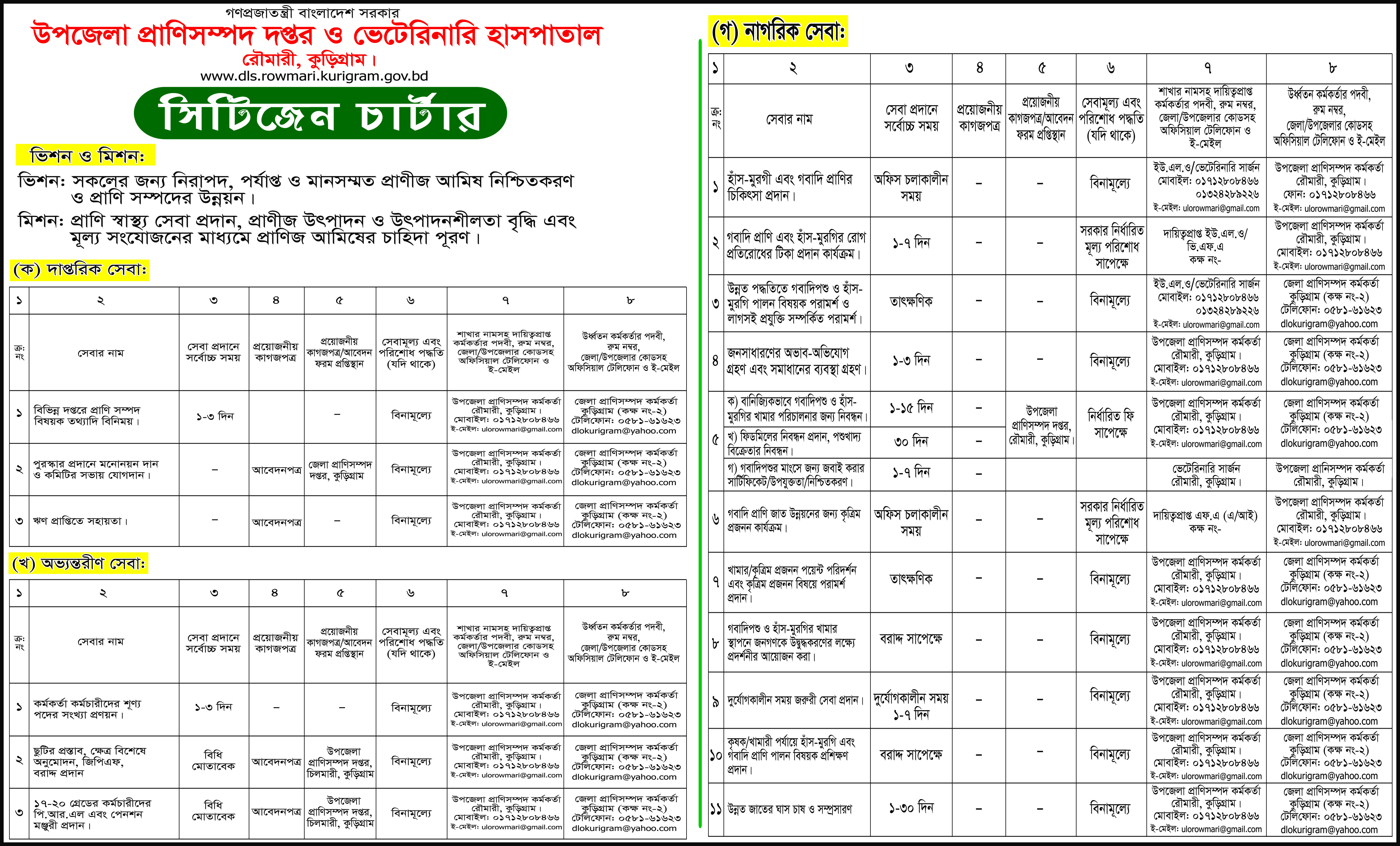 ঙ) প্রাকৃতিক দুর্যোগ চলাকালীন সময়ে স্থানীয় প্রশাসন, জনপ্রতিনিধি ও বেসরকারি সেবামুলক প্রতিষ্ঠানের সহযোগিতা, গবাদি প্রাণি ও হাঁস-মুরগীর জরুরী চিকিৎসা, টিকা প্রদান ও ত্রান বিতরণ । | ঐ | ঐ | বিনা মূল্যে সরকারি বিধি মোতাবেক | |